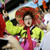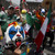 A masked girl poses for photo surrounded by Mexico soccer fans as they watch their team's World Cup match with Brazil on giant television screens in Mexico City's main square, the Zocalo, Tuesday, June 17, 2014. (AP Photo/Rebecca Blackwell)