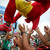 A British fan, left, and his friends, unseen, joke as a Spanish girl consoles her boyfriend, right, at the fan park after the World Cup soccer match between Spain and Chile, in Madrid, Spain, Wednesday, June 18, 2014. Spain lost the match which knocks them out of the World Cup. (AP Photo/Andres Kudacki)